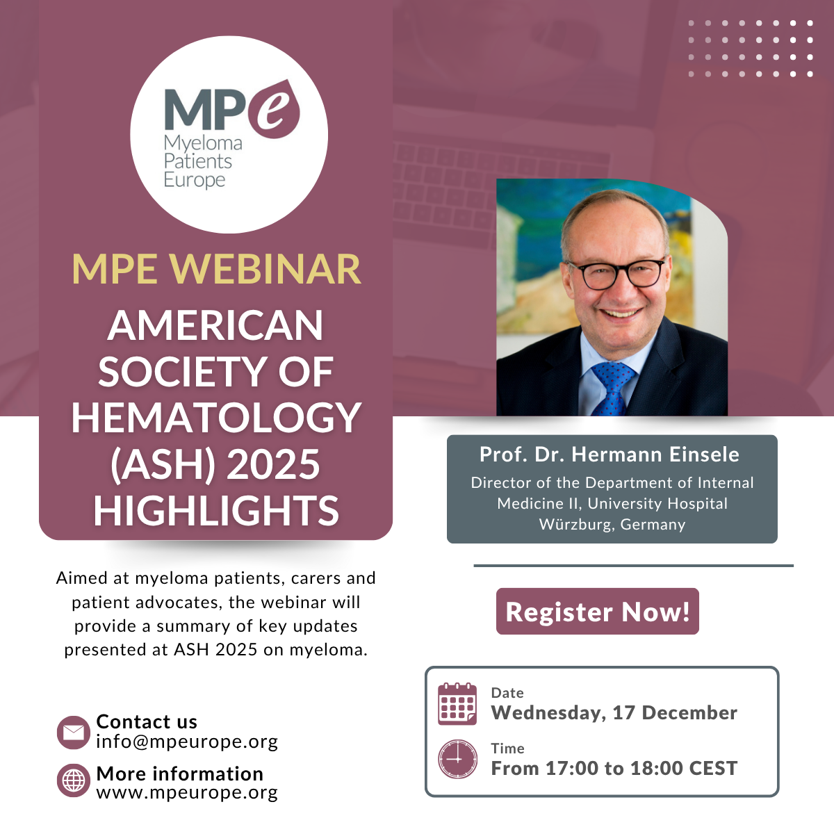 The webinar will be held on Wednesday, 17 December 2025, from 17:00 – 18:00 CET. It will be led by Prof. Dr. Hermann Einsele, Director of the Department of Internal Medicine II, University Hospital Würzburg, Germany. Prof. Dr. Einsele will give a 40-minute presentation followed by a 20-minute Q&A session, where attendees can submit their questions.